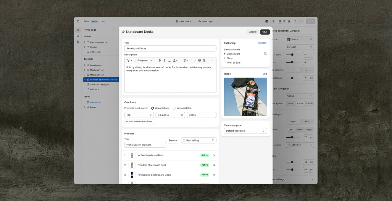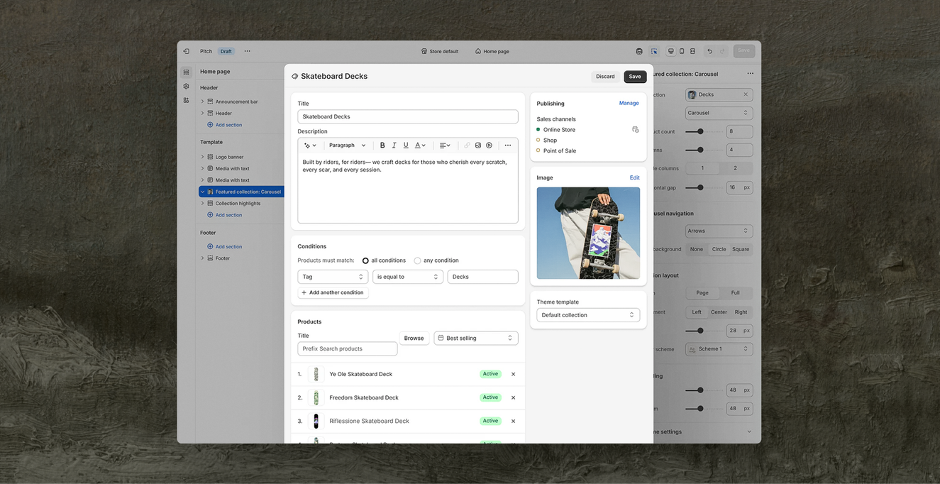 You're designing a product page, you realise the price is wrong, you have to leave the theme editor, navigate to Products, find the SKU, update it, go back, refresh, and... you've lost your flow. Being able to edit products, collections, metafields, and markets without leaving the editor means you stay in the zone and get more done.