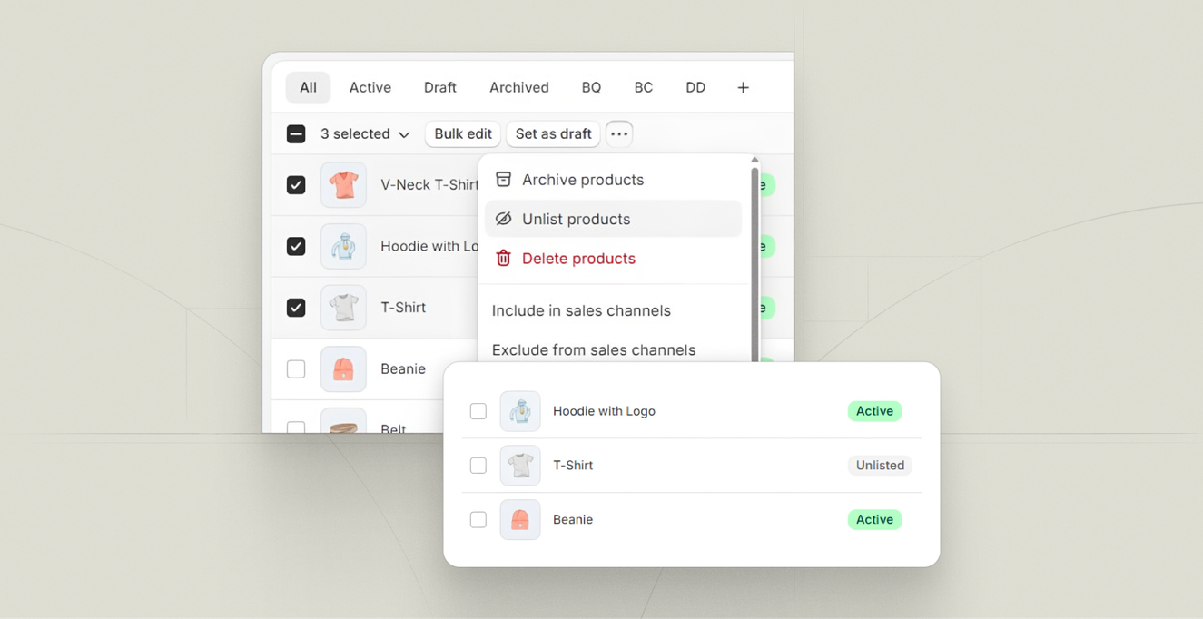 Shopify devs have been jerry-rigging hidden products for years—unpublishing from channels, using weird collection logic, hacking noindex tags into templates. Unlisted status makes this a first-class feature: products are live at their URL but hidden from search, collections, and sitemaps.