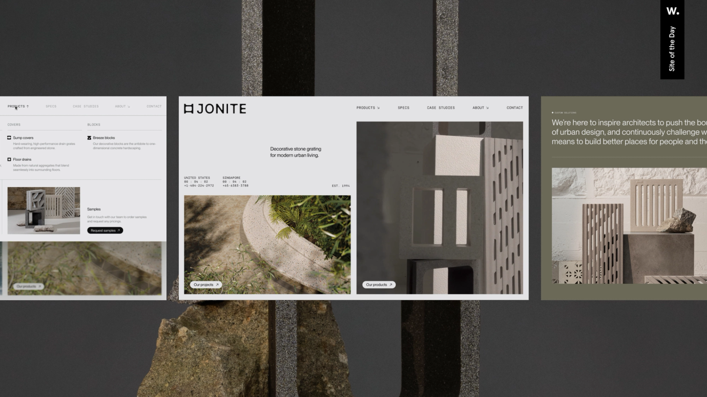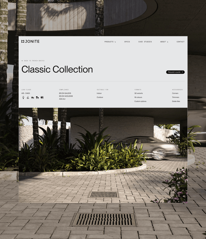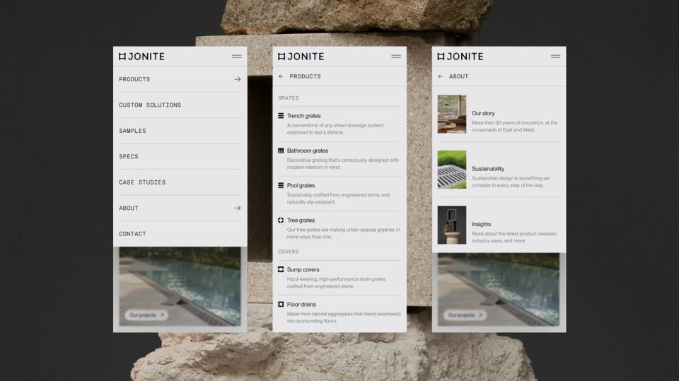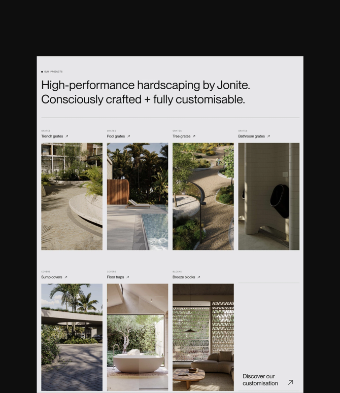 Jonite’s new identity and website had to speak to three distinct audiences—architects, urban planners, and interior designers—each with their own needs and priorities. Every item in Jonite’s extensive product catalogue came with its own load ratings, certifications, colour and customisation options. Plus, we had to showcase engineered stone as premium and sustainable; something beautiful as well as functional.